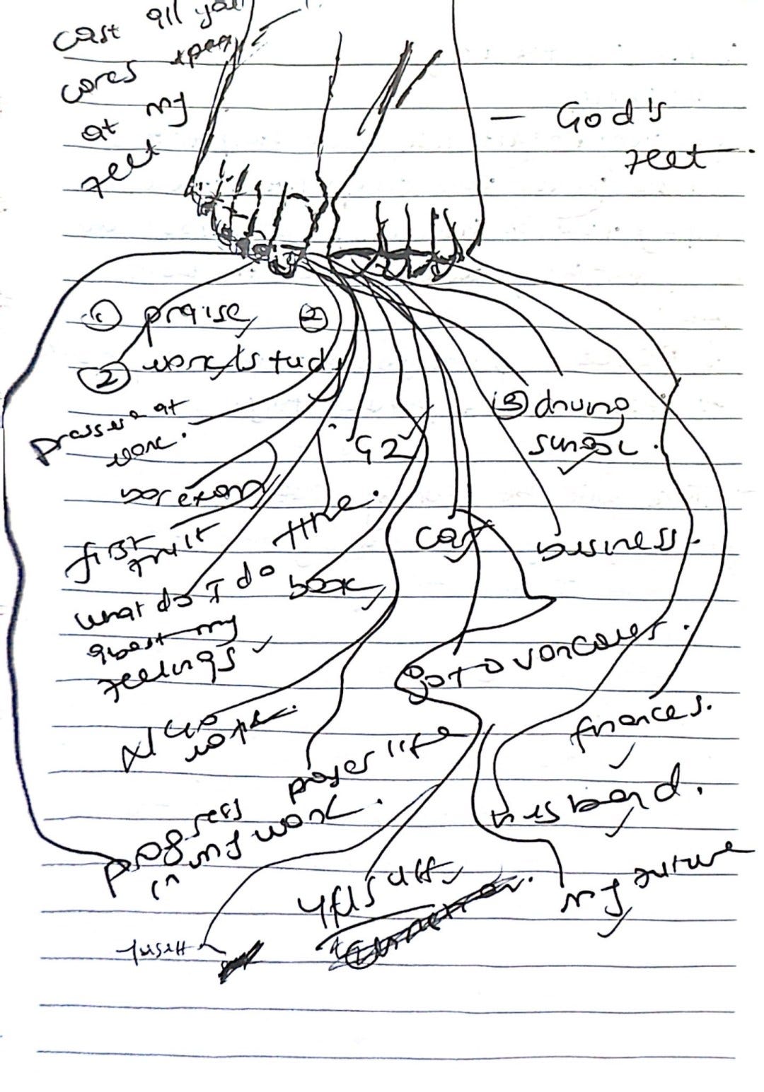So instead of worrying, surrender everything to Him in prayer and if you’re feeling creative, try drawing Jesus’ feet and placing your worries there (hopefully, your drawing is better than mine!). Please share it with me—I’d love to see it! 😂